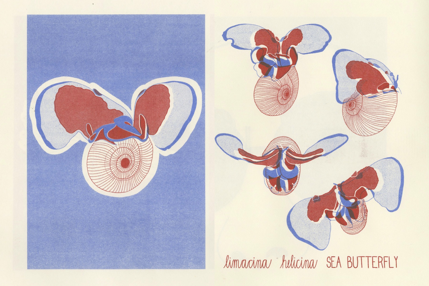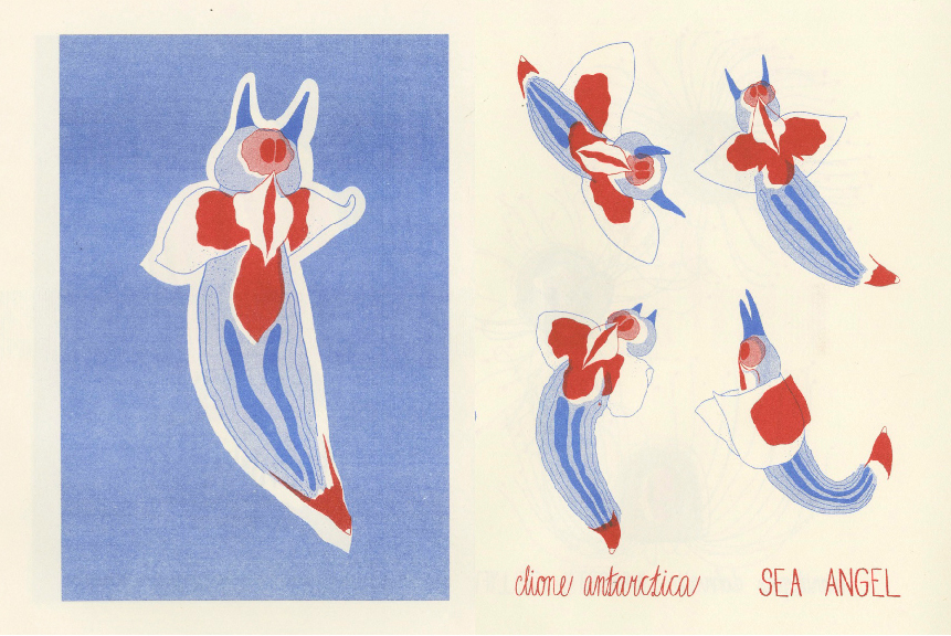 Deep Sea (2019) is an edition of 30 self-published zines, Riso-printed in Blue and Bright Red at the Robert Blackburn Printshop in New York. It documents a few of the microscopic creatures living in the deepest seas, together with their binominal latin names as well as beautiful nicknames.